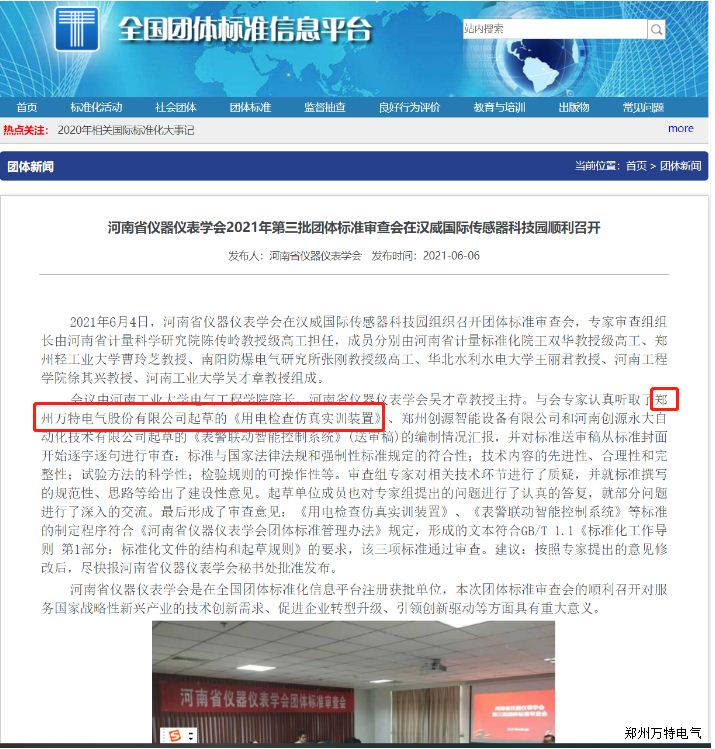 近日,由萬特電氣制定的河南省儀器儀表學(xué)會團體標準《用電檢查仿真實訓(xùn)裝置》T/HIS 006,于2021年6月11日發(fā)布,將于2021年7月10日實施。