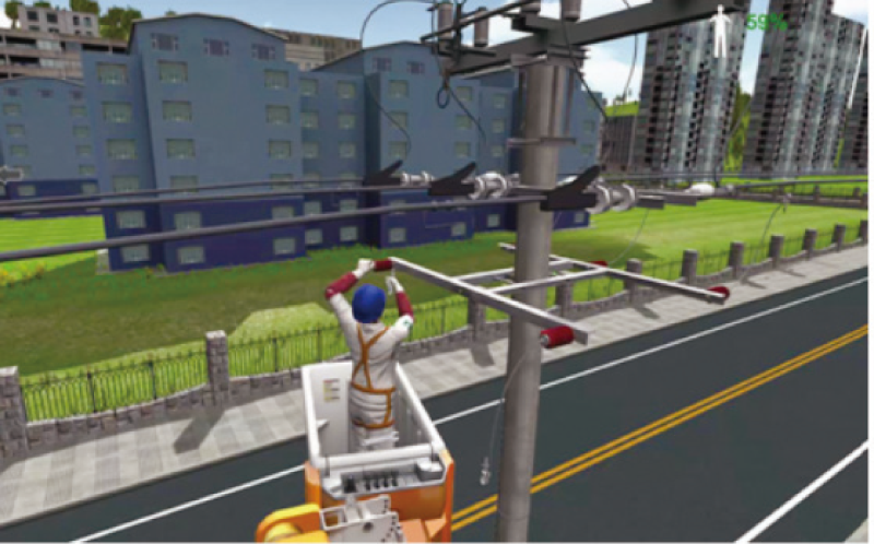 配網(wǎng)帶電作業(yè)VR 實(shí)訓(xùn)系統(tǒng)采用VR 多人互動(dòng)技術(shù)和仿真絕緣斗臂車平臺(tái)相結(jié)合的方式,為參訓(xùn)人員提供沉浸式 的作業(yè)環(huán)境。培訓(xùn)人員按各自崗位在虛擬環(huán)境中,扮演不同的作業(yè)人員模擬開展帶電作業(yè),真實(shí)感受作業(yè)工 況和操作職責(zé),在違章時(shí)通過畫面、聲音、文字、觸覺感知等形式給予實(shí)時(shí)的反饋與警示,系統(tǒng)在確保人身 安全的前提下進(jìn)行高仿真的虛擬培訓(xùn),能夠有效提升學(xué)員的應(yīng)變能力和實(shí)操技能。