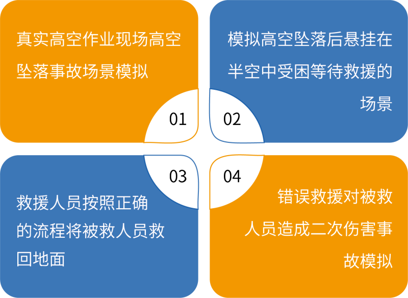 本項(xiàng)目在虛擬環(huán)境中模擬高空作業(yè)人員從高處墜落后發(fā)生安全帶吊掛事故,懸停在半空中等待救援的場(chǎng)景。施救 人員攜帶高空救援用品采用正確的施救方法將受困人員救回地面,訓(xùn)練學(xué)員高空救援的技能。