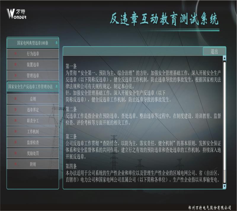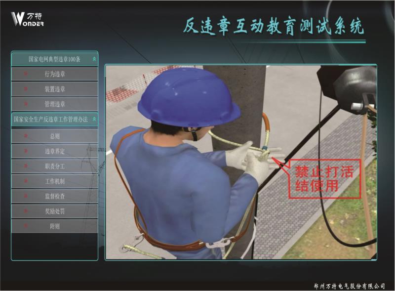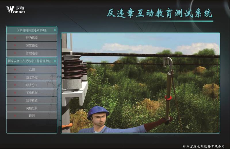 反違章互動測試系統(tǒng)設(shè)計案例依據(jù)國家電網(wǎng)公司編寫的 《國家電網(wǎng)公司安全生產(chǎn)違章100條》,進(jìn)行編制相關(guān) 事故,遵循《國家電網(wǎng)公司電力安全工作規(guī)程》進(jìn)行正 確動畫的制作。反違章互動測試系統(tǒng)運(yùn)用三維動畫等先 進(jìn)開發(fā)技術(shù)逼真還原事故過程、事故現(xiàn)場,突破了傳統(tǒng) 安全教育不能用視頻重現(xiàn)事故過程的缺點(diǎn)。更真實(shí)的展 現(xiàn)違章作業(yè)過程,更直觀的感受到違章作業(yè)后果,更深 刻的理解遵章作業(yè)的重要意義。